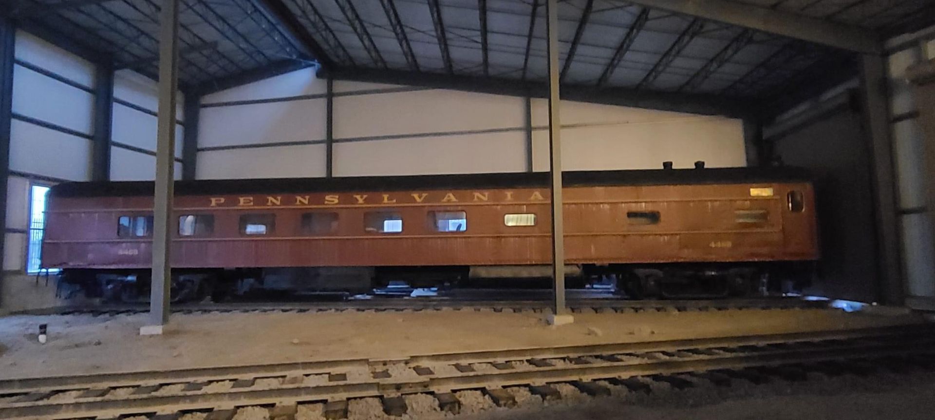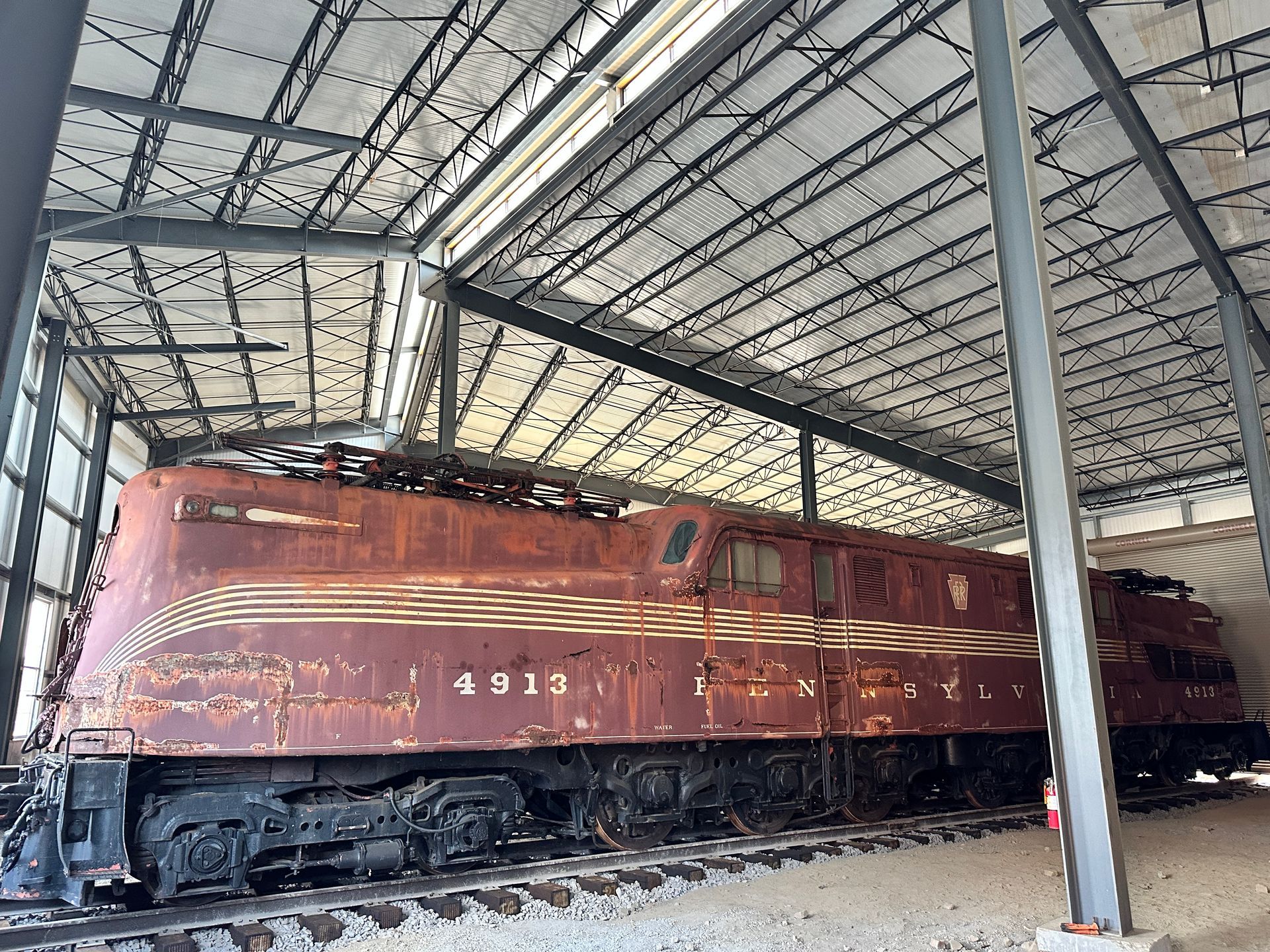 Note: GG-1 No. 4913 is currently stored inside of the Harry Bennett Memorial Roundhouse in the storage area. This was done to prevent further deterioration of the body and frame from the outside elements. The Railroaders Memorial Museum has plans in place for the restoration of No. 4913. Donations are greatly appreciated!