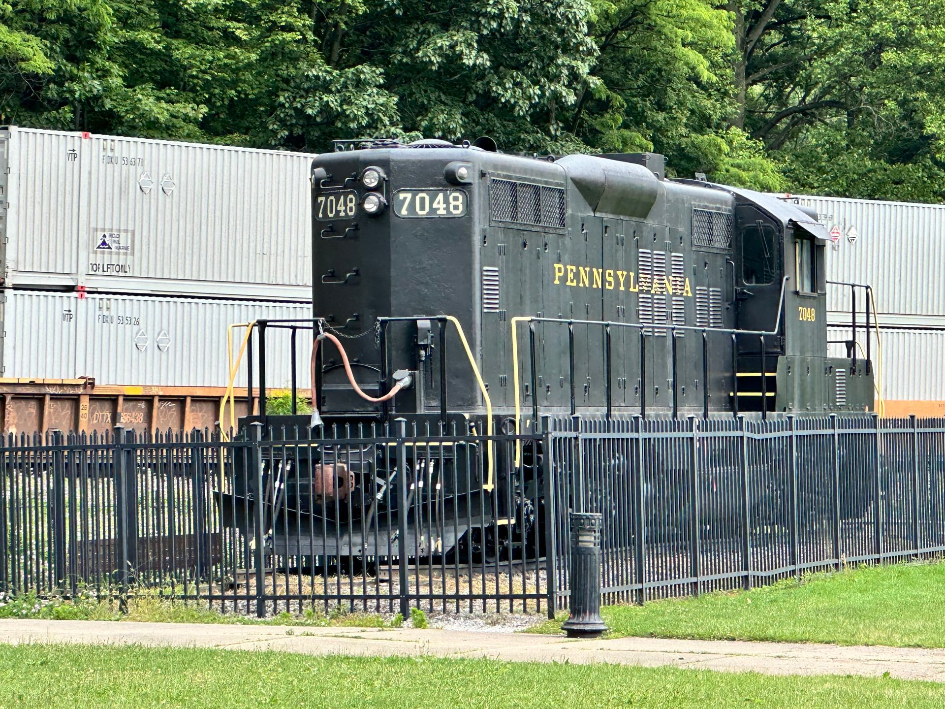 This is on permanent exhibit at the Horseshoe Curve, replacing K4 1361 when it was brought down for restoration in 1985. This diesel was built in December, 1955 by the Electro-Motive Division of General Motors Corp. Diesel electric locomotives of this and similar types are the ones that pushed the last of the steam locomotives into retirement in the 1950s. No. 7048 was retired in 1985 after having served the Pennsylvania Railroad, Penn Central, and Conrail for nearly 30 years. It was one of 270, 1750 hp units built for freight services.