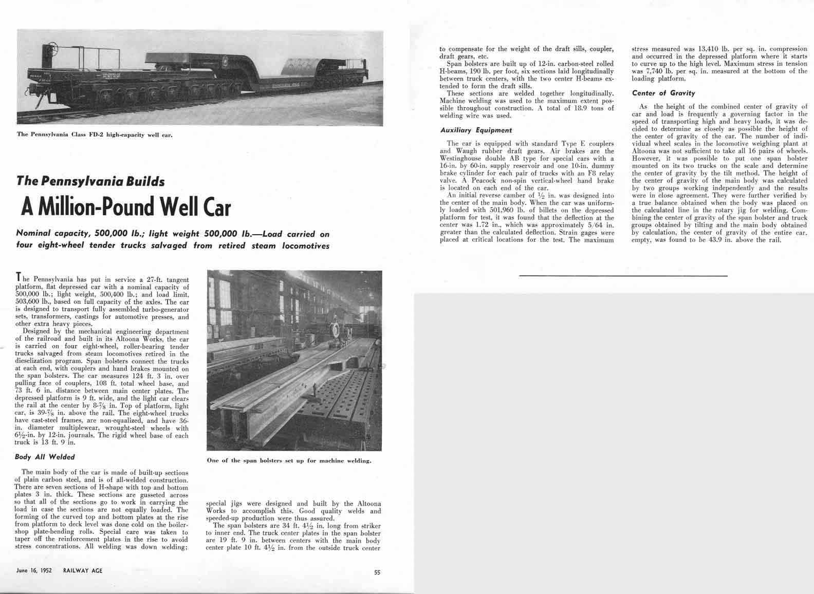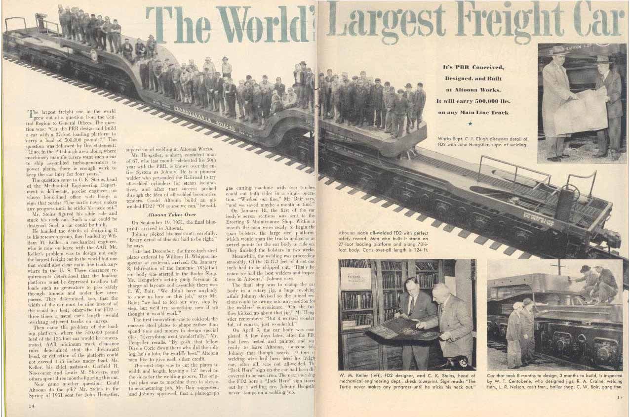 Nicknamed the Queen Mary, No. 766163 was built in 1952 at the Juniata Shops. It was designed to transport turbo-generator sets, transformers, castings for automotive presses, and other heavy objects.